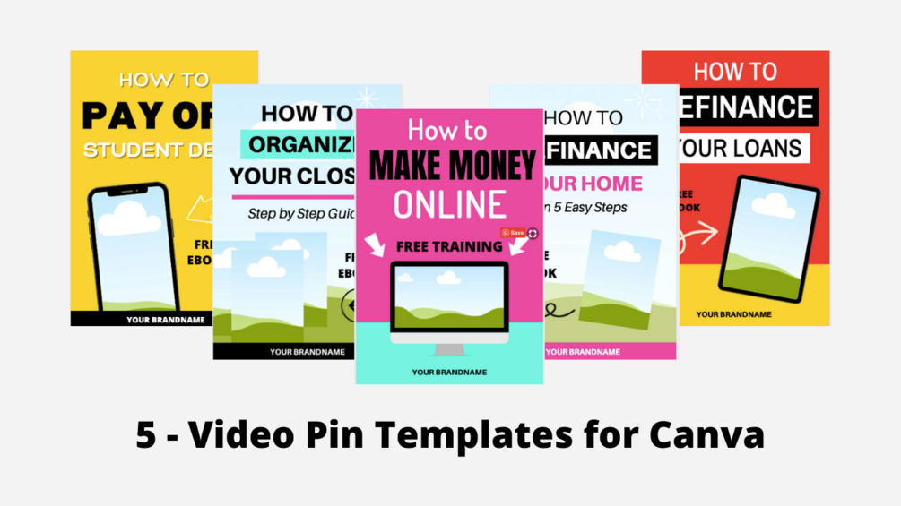 Easily create Video Pin Graphics for your content! This template pack includes 5 Canva designed Video Pin Templates for Pinterest. No actual video is required to use these templates because they use animated Canva elements in the design. Help your content stand out with these easy to customize video pin templates!